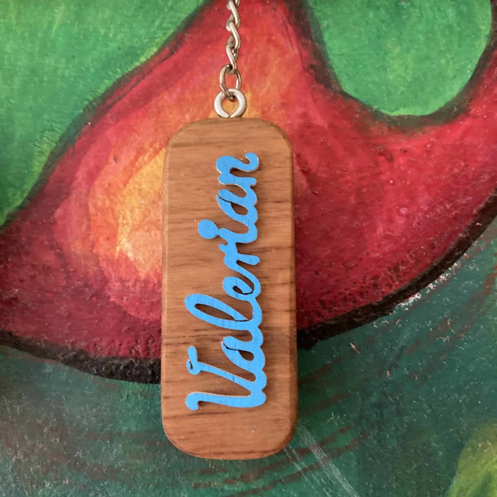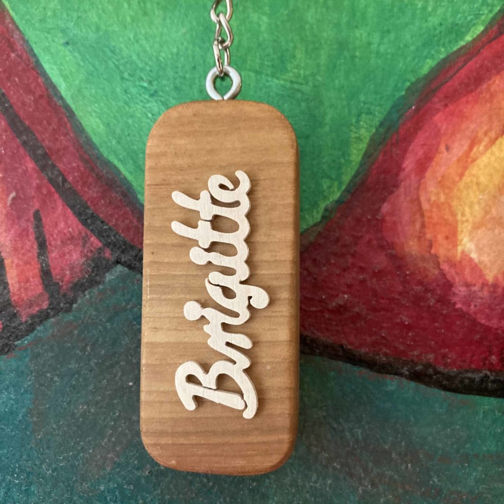 Schriftzug auf Nussbaum-Anhänger: Unsere Schlüsselanhänger-Rohlinge fertigen wir aus heimischem Nussbaum. Diese individualisieren wir mit frei Hand gesägten Namen, Wörtern, Lieblingsmotiven, Firmenlabeln etc.